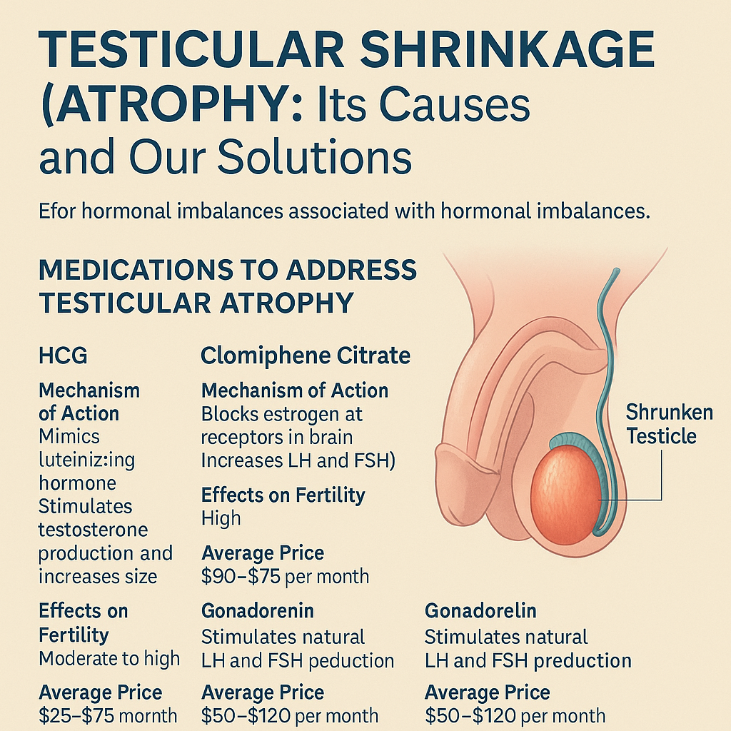 Testicular atrophy—commonly described by men as testicular “shrinkage”—is one of the most frequent concerns associated with testosterone therapy, long-term anabolic use, or disruptions in normal hormonal signaling. While it is distressing, testicular atrophy is both understandable physiologically and highly treatable with the correct medications.